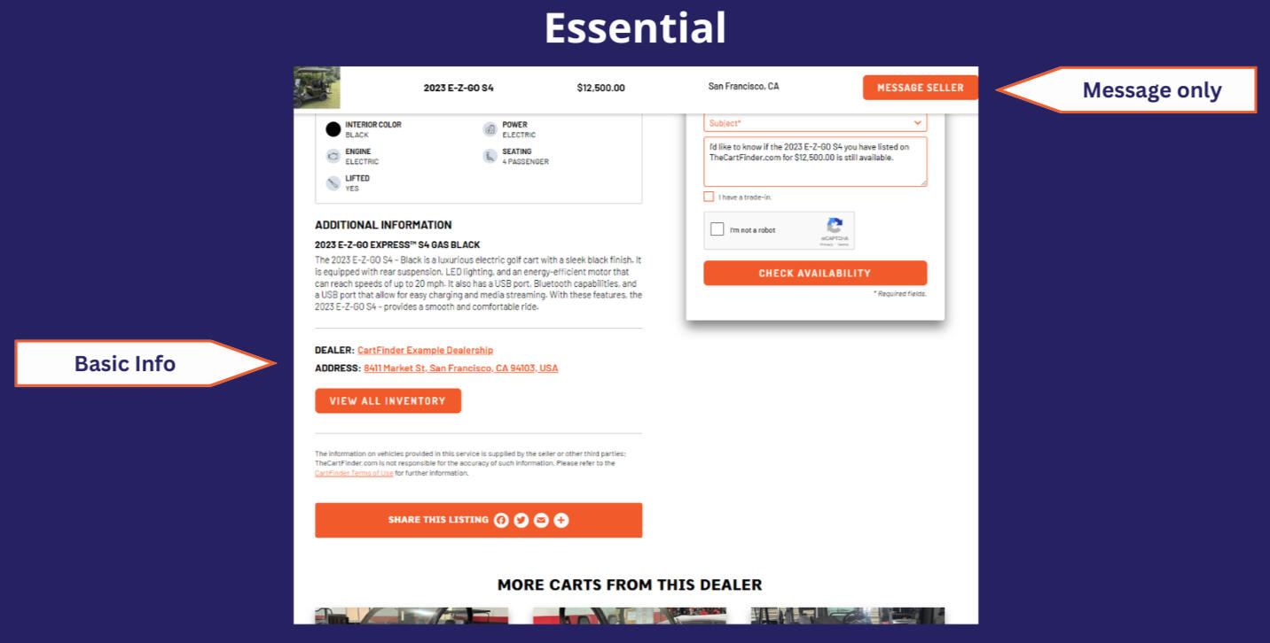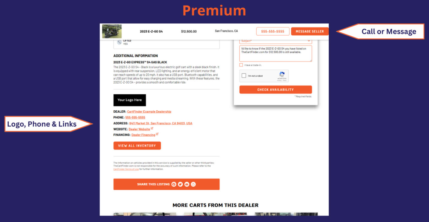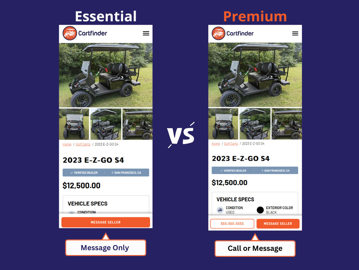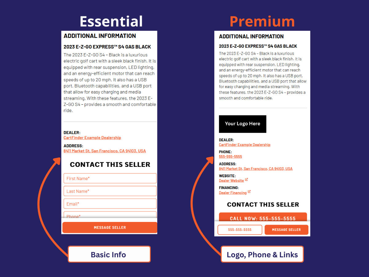 See how listings differ on Essential vs. Premium. Premium includes your phone number, logo, and direct links to your website and financing page.